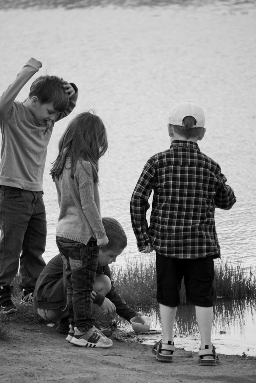 Монохромный снимок детской компании у водоёма. Композиция построена на взаимодействии четырёх детей: один играет с водой, остальные наблюдают. Естественная поза, игра света и тени, текстурные контрасты берега и воды — пример удачного кадра в жанре семейной и детской фотографии