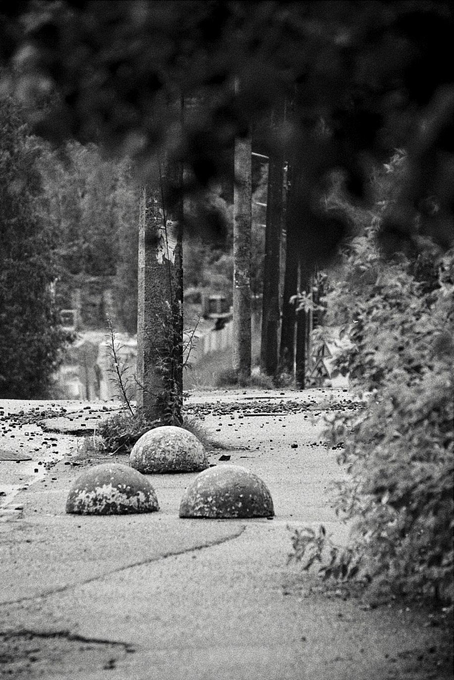 Монохромный снимок индустриального пейзажа: бетонные полусферы на растрескавшемся асфальте, массивные столбы на заднем плане, частично скрытые растительностью. Работа с глубиной резкости и контрастами создаёт драматичный эффект. Пример урбанистической съёмки с элементами абстракции.