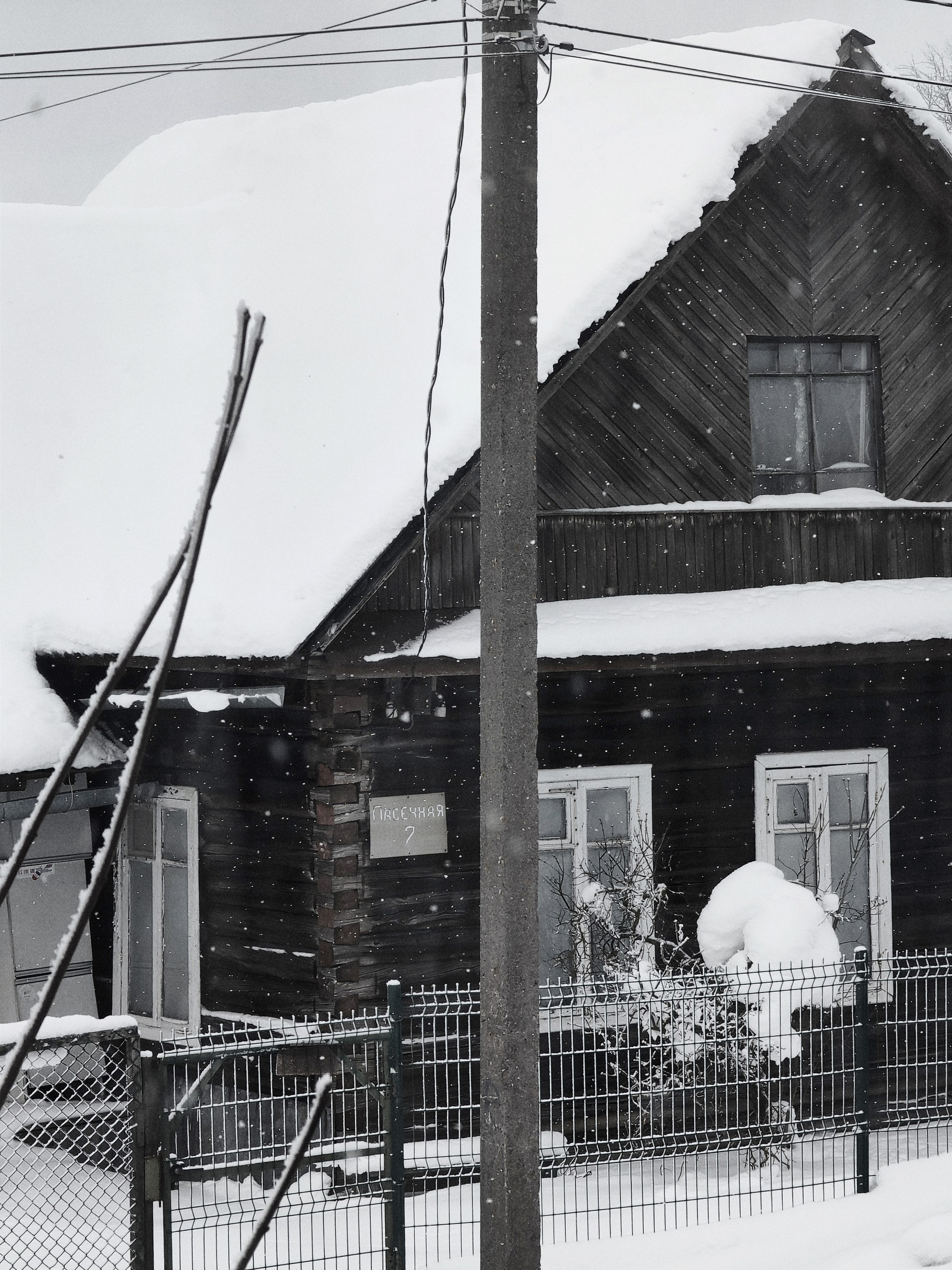Зимняя идиллия: деревенский дом, снег, тишина. Монохромный снимок с атмосферой уюта и покоя.