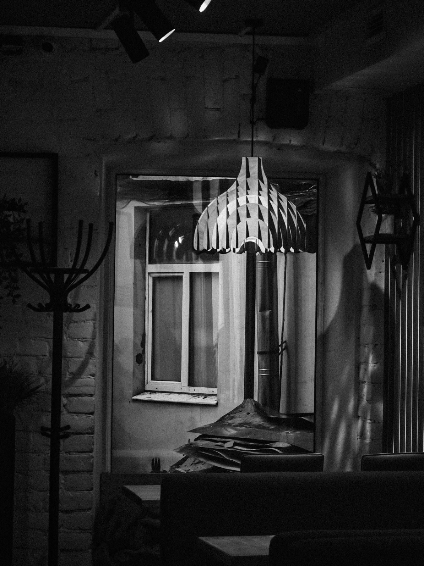 Черно-белый снимок, на котором запечатлена игра света и тени в современном интерьере. Подвесной светильник Flos Chasen создает замысловатые узоры, контрастирующие с кирпичными стенами в деревенском стиле и мебелью в стиле минимализма. Окно на заднем плане добавляет глубину, создавая мрачную атмосферу искусства.