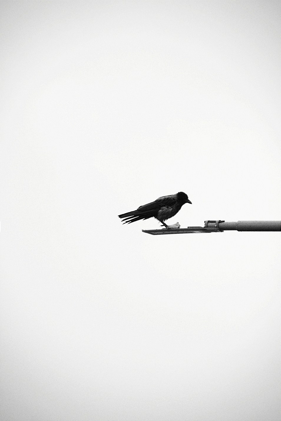 Чёрно-белая фотография воплощает лаконичную красоту природы в урбанистическом пространстве. На краю уличного фонаря сидит одинокая ворона, её силуэт чётко выделяется на фоне светлого неба. Простота композиции и контраст между птицей и пустым пространством создают ощущение тишины и задумчивости. Этот кадр — о встрече дикой природы с городским ландшафтом, о мгновении, застывшем во времени.